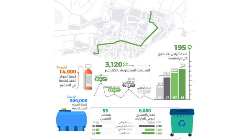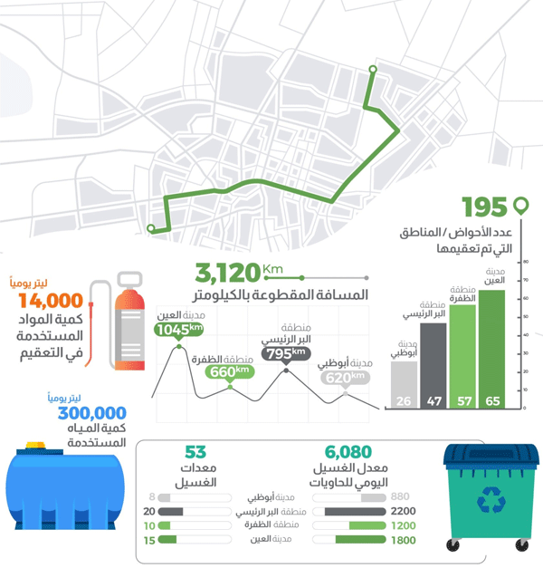 كشفت دائرة البلديات والنقل في أبوظبي عن تعقيم مسافة 3 آلاف و120 كيلومتراً في الإمارة، تشمل 1045كيلومتراً في مدينة العين و660 كيلومتراً في منطقة الظفرة و795 كيلومتراً في منطقة البر الرئيسي و620 كيلومتراً في مدينة أبوظبي، مؤكدة وفقاً لأحدث إحصاءات أعمال برنامج التعقيم الوطني في العاصمة، أنه يتم استخدام 14 ألف لتر من مواد التعقيم و300 ألف لتر من المياه يومياً.