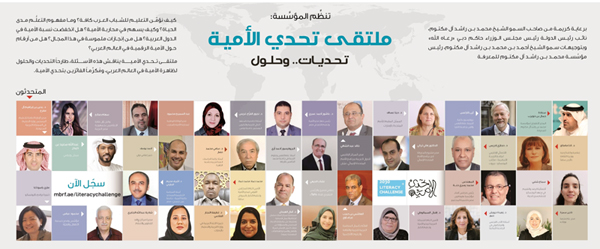 تحت رعاية صاحب السمو الشيخ محمد بن راشد آل مكتوم نائب رئيس الدولة رئيس مجلس الوزراء، حاكم دبي، «رعاه الله»، وبتوجيهات سمو الشيخ أحمد بن محمد بن راشد آل مكتوم، رئيس مؤسسة محمد بن راشد آل مكتوم للمعرفة، تنطلق اليوم فعاليات «ملتقى تحدي الأمية»، وذلك في نسخته الأولى التي تنظمها مؤسسة محمد بن راشد آل مكتوم للمعرفة في دبي تحت شعار «تحديات وحلول» يومي 24 و25 فبراير الجاري، وذلك في فندق هيلتون دبي الحبتور سيتي.
