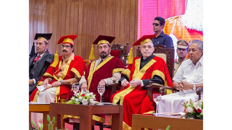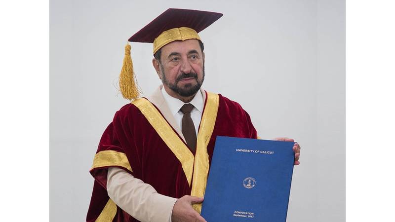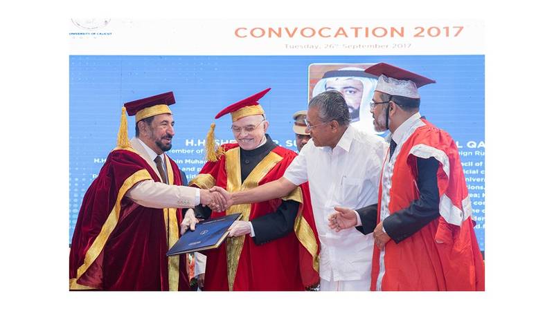 وكانت مراسم منح الدكتوراه الفخرية قد بدأت بارتداء صاحب السمو حاكم الشارقة عباءة ووشاح الدكتوراه، عقب ذلك أعلن جستس بي ساداسيوم محافظ ولاية كيرالا بدء مراسم الاحتفال، بعدها تلا وزير التعليم في ولاية كيرالا قرار مجلس جامعة كاليكوت بمنح صاحب السمو الشيخ الدكتور سلطان بن محمد القاسمي الدكتوراه الفخرية، نظراً لدور سموه البارز والجوهري في النهوض بالثقافة والآداب والفنون، إلى جانب انشغاله واهتمامه بتشييد المراكز البحثية والمؤسسات التعليمية المتميزة.