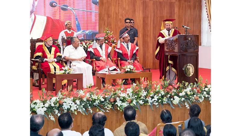 وبهذه المناسبة ألقى رئيس حكومة كيرالا كلمة أشاد بها بجهود سموه في توطيد علاقات التعاون المشترك بين إمارة الشارقة وكيرالا، متطرقاً للحديث عن السيرة الذاتية الخاصة بسموه وأهم إنجازاته على المستويين التعليمي والثقافي، مؤكداً أن اختيار جامعة كاليكوت لمنح صاحب السمو حاكم الشارقة الدكتوراه الفخرية أمر غاية بالأهمية لأنها تُمنح لشخص يستحقها وبجدارة.