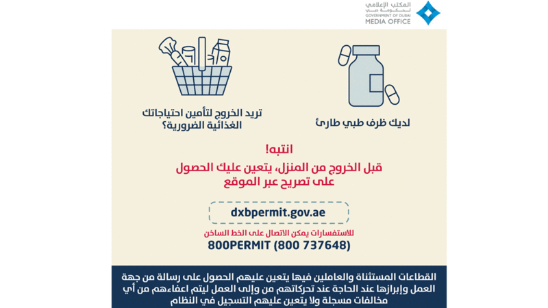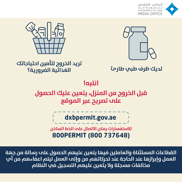أطلقت اللجنة العليا لإدارة الأزمات والكوارث في دبي، الموقع الإلكتروني dxbpermit.gov.ae لكل من يرغب في التسجيل للحصول على ترخيص لمغادرة المنزل خلال فترة التعقيم الشامل لإمارة دبي والتي بدأت مساء أمس الأول السبت، وستستمر لمدة أسبوعين، وعلى مدار 24 ساعة يومياً، حيث إن التسجيل عبر هذا الموقع والحصول على الترخيص من خلاله شرط أساسي للخروج من المنزل لأفراد المجتمع من عامة الناس، لتأمين الاحتياجات الضرورية سواء الغذائية، أو الصحية، أو لإجراء الفحوص المتعلقة بفيروس كورونا المستجد.