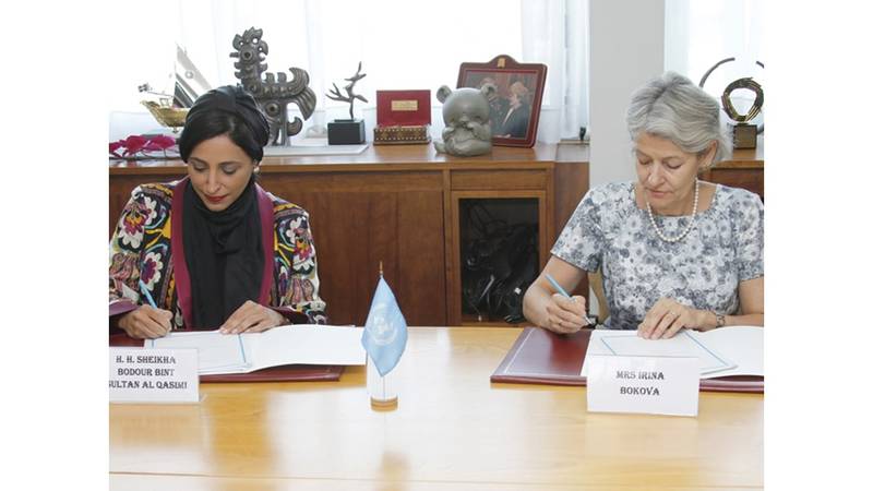 وقعت الشيخة بدور بنت سلطان القاسمي، مؤسسة ورئيسة جمعية الناشرين الإماراتيين، ورئيسة اللجنة المنظمة لملف الشارقة العاصمة العالمية للكتاب، وإيرينا بوكوفا، المديرة العامة لمنظمة الأمم المتحدة للتربية والعلم والثقافة «اليونيسكو»، يوم أمس الأول في العاصمة الفرنسية باريس، مذكرة تفاهم لتعزيز التعاون في المجال الثقافي، وخصوصاً ما يتعلق بتنظيم الفعاليات التي تحتفي بالكتاب وتسهم بنشر القراءة.