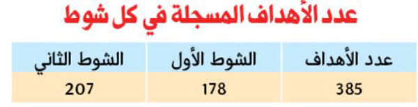 وتفاوت تسجيل الأهداف ما بين شوطي المباراة الواحدة؛ لكن الكفة كانت أكثر ترجيحاً «للشوط الثاني» بعدما شهد المباريات تسجيل 178 هدفاً في الحصة الأولى، مقابل 207 أهداف في الشوط الثاني.