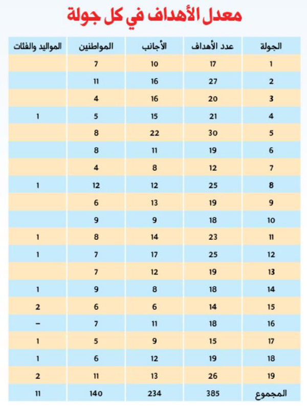 أما على مستوى الهدافين، فقد مالت الكفة بشكل لافت وكبير لمصلحة اللاعبين الأجانب، بعدما كانت حصيلة الأجانب خلال الجولات ال19 التي لعبت 234 هدفاً، مقابل 140 هدفاً للاعبين المواطنين، و11 هدفاً للاعبي الفئات الأخرى من مقيمين ومواليد.