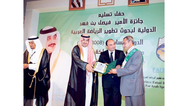 بحضور الأمير نواف بن فيصل بن فهد بن عبدالعزيز الرئيس العام لرعاية الشباب في المملكة العربية السعودية رئيس اتحاد اللجان الأولمبية العربية، يتم في السابعة من مساء اليوم بقاعة بني ياس 2 بفندق جراند حياة - دبي، تكريم الفائزين في فئات الدورة الثامنة من "جائزة الأمير فيصل بن فهد الدولية لبحوث تطوير الرياضة العربية" .