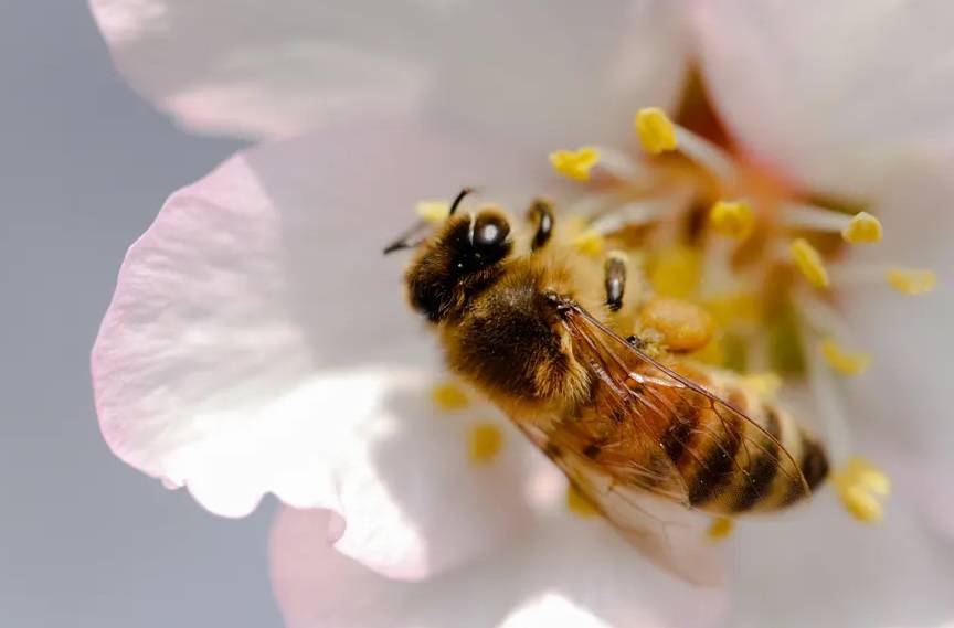 نحلة ترتشف رحيق زهرة اللوز في حديقة بادامواري في سريناغاربالهند في يوم ربيعي مشمس