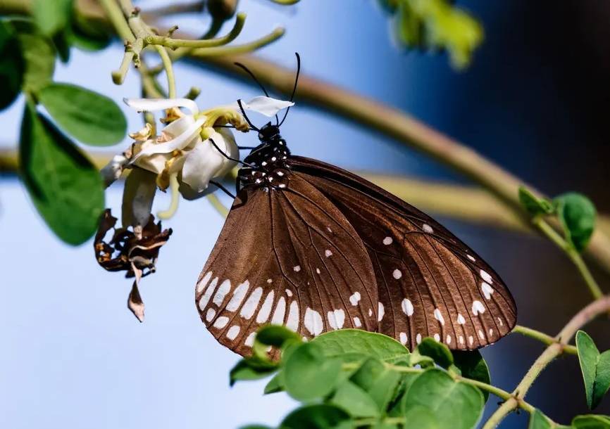 فراشة الغراب الشائعة (يوبليا الأساسية) تمتص الرحيق من زهرة على فرع مرتفع لشجرة المورينجا في ولاية البنغال الغربية بالهند.