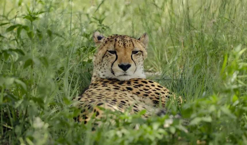 فهد يستلقي في محمية في شمال غرب جنوب إفريقيا حيث أثر الصيد الجائر والجفاف واستنفاد الموارد المائية وتدمير المواطن سلباً في حياة الحيوانات في المحمية