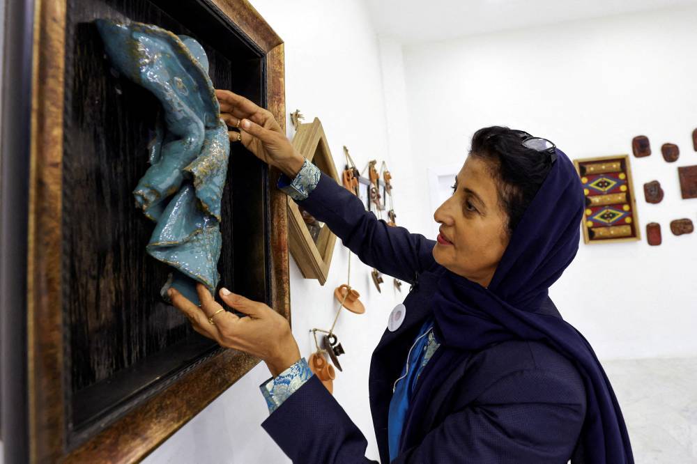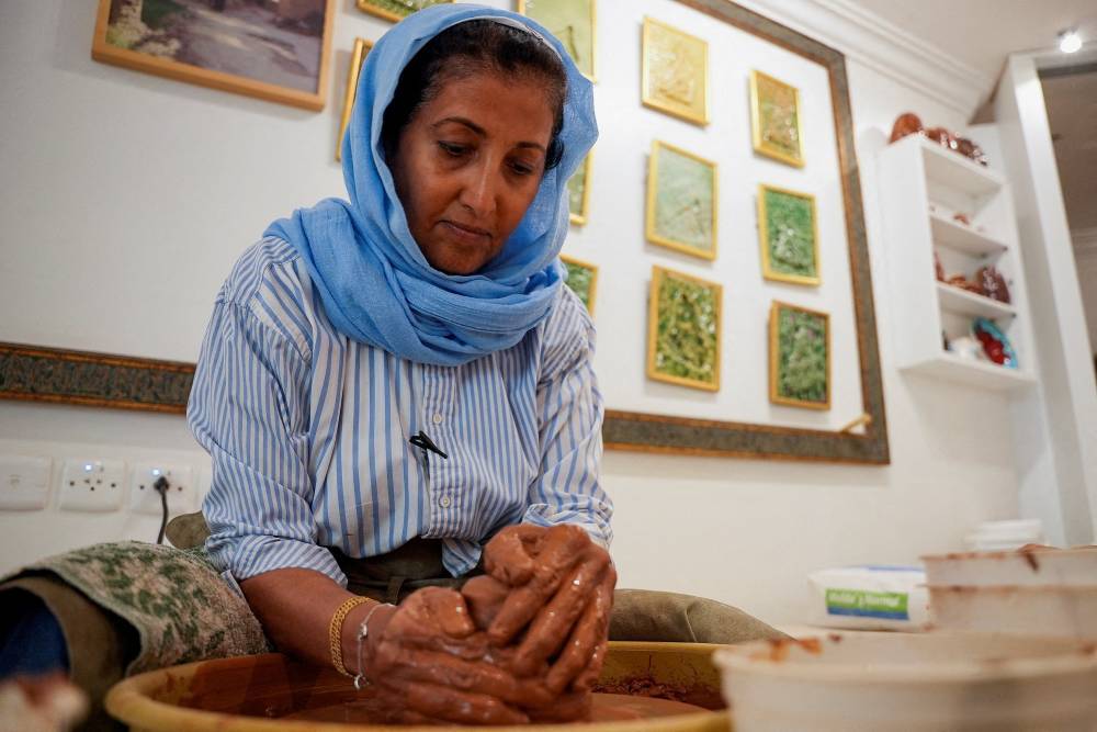 تعرض الفنانة التشكيلية السعودية عواطف القنيبط، المهتمة بالخزف والرسم عليه، أعمالها، الفنية في صالة عرض بمنزلها بالعاصمة الرياض.