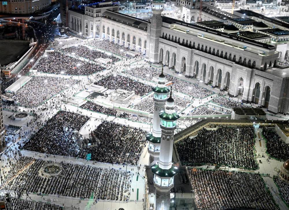 General view of muslims performing evening prayers at the Grand Mosque during the holy month of Ramadan, in the holy city of Mecca, Saudi Arabia, in this handout image obtained by Reuters on April 12, 2023. Saudi Press Agency/Handout via REUTERS ATTENTION EDITORS - THIS PICTURE WAS PROVIDED BY A THIRD PARTY