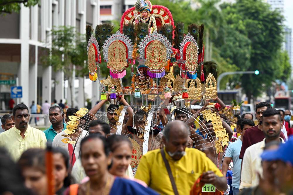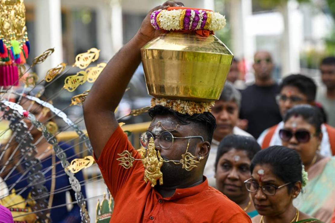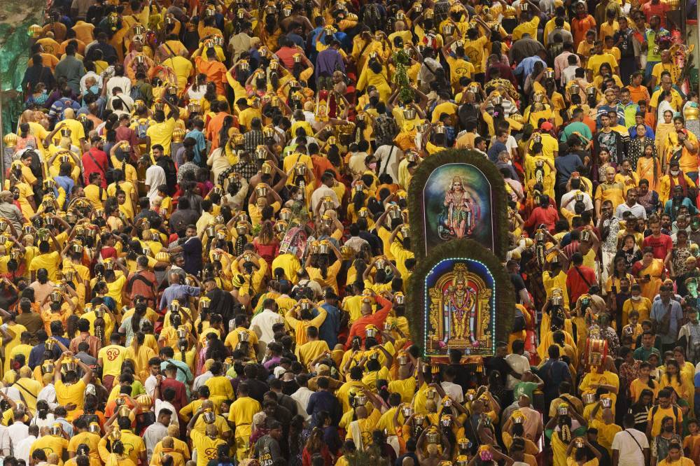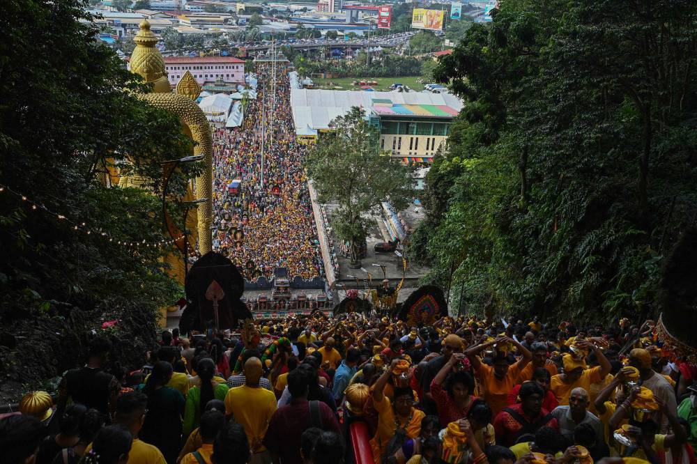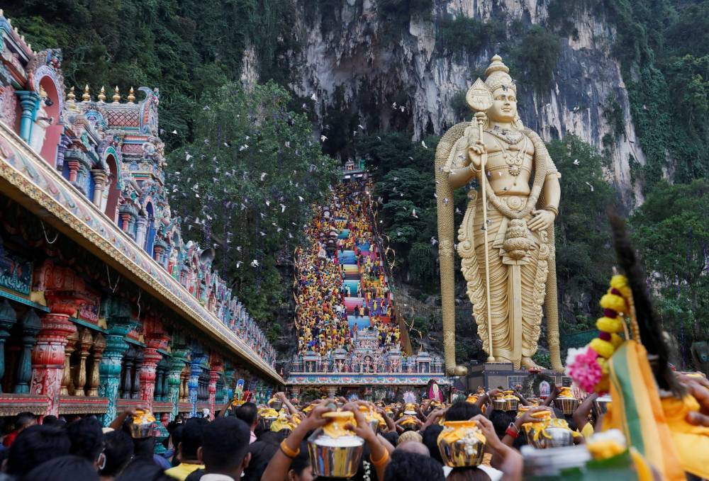 وحمل آخرون قدور من الحليب وهياكل معدنية مزخرفة ثقيلة يطلق عليها «كافاديس»، وصعد المصلّون حفاة 272 درجة للوصول إلى المعبد، المقدس لدى الهندوس المحليين.