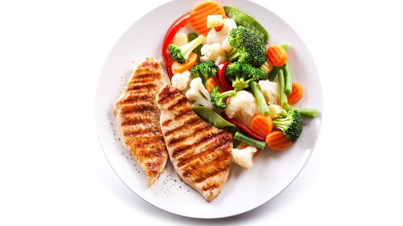 وتتضمن وجبة الغداء شريحة فقط من اللحوم الحمراء أو صدور الفراخ، وتكون خالية من الدهون، مع السلطات والخضار، يفضل البروتين النباتي، مثل البقوليات وغيرها، أما العشاء فيحتوي على جبن قريش وكوب لبن وقبله قطع من الفواكه.