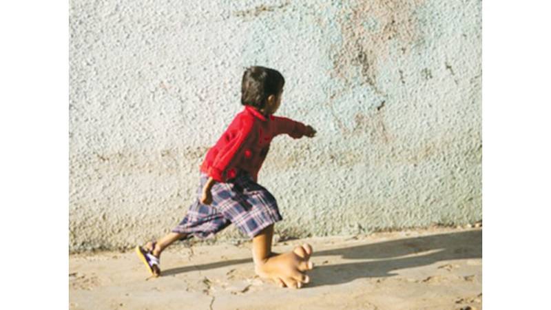 طفل يركض بقدم وزنها 5 كيلوغرامات