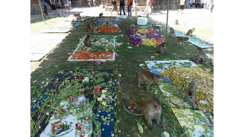 }} مهرجان القرود في تايلاند: تتمتع مدينة لوب - بوري في تايلاند بالعديد من المعالم الأثرية السياحية والمعمارية، إلى جانب عدد هائل من القرود، التي تحظى بمكانة كبيرة لدى سكان المدينة لسببين، أولهما تاريخي ديني، حيث اعتبرت البوذية القرود أبطالاً، والثاني اعتبارها وسيلة لجذب السياح إلى البلاد، لذلك يحرص سكان البلاد على صحة وسلامة القرود. وينظم السكان المهرجان باستضافة عدد كبير من القرود حيث يعدون لها بوفيه مفتوحاً يضم أنواعاً مختلفة من الفاكهة والخضراوات والعصائر، على مساحة ألفي كم. ويشهد المهرجان السنوي إلى جانب السكان المحليين عدد كبير من السائحين، ويقام بشكل منتظم منذ عام 1988 على شرف البطل الأسطوري «راما» الذي قالت عنه الأساطير إنه كافأ ملك القرود لمساعدته في واحدة من معاركه، فبات هذا اليوم موعداً ثابتاً لاحتفال سنوي يتبرع فيه التايلانديون بالفواكه والخضراوات لإطعام القرود، رداً للجميل. ويستخدم حوالي 3 أطنان من الفواكه والخضراوات في هذا البوفيه الاحتفالي.