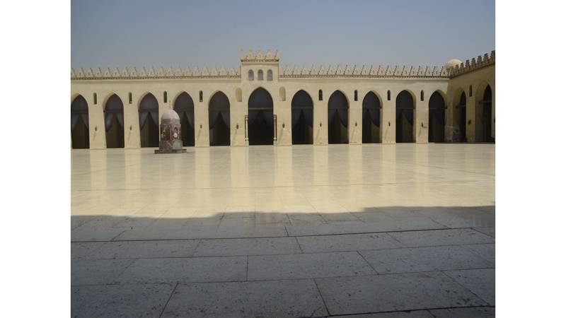 وتبلغ مساحة المسجد 16200 متر مربع، ويعتبر صحن المسجد من أكبر الصحون في المساجد المصرية، وهو مكسو بالرخام الأبيض، تحيطه أعمدة رخامية، وتوجد به أربعة أروقة، ويعد الرواق الشمالي أكبرها، ويوجد به محرابان ومنبر خشبي، كما يوجد بالمسجد ثلاث قباب كبيرة، تتميز بخصائص العمارة الفاطمية، وتوجد قباب أخرى في مدخل المسجد، تطل على شارع المعز، ويتميز المسجد بكثرة الزخارف ووجود خطوط متنوعة، مثل الخط الكوفي المكتوب بالآيات، كما توجد بالمسجد مجموعة من النوافذ الصغيرة، وحوائط مطلية بالجص، وأضافت الزخرفة المنحوتة على الحجارة رونقاً، وهذه العمارة لها مثيلاتها، مثل مسجد الأقمر، والصالح طلائع. ويمتلئ المسجد بالشرفات والمشربيات، خاصة تلك التي تلتف حول محرابه موشاة بالذهب والفضة، كما كان يحتوي على أندر وأفخم أنواع النجف في العالم، وتتوسط صحن المسجد فسقية للوضوء، كما يوجد في الركن الشمالي والركن الجنوبي الغربي أحواض للوضوء، وتتميز حوائط المسجد بالارتفاع، وعلو نوافذه، لتكون مصدر تهوية جيدة.