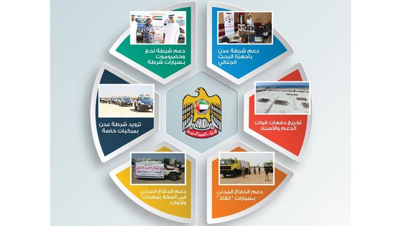 وأعطت الإمارات أولوية كبيرة ودعماً مشهوداً في إعادة الإعمار، ضمن عملية «إعادة الأمل» في المناطق المحررة باليمن مقدمة دعماً سخياً لمشاريع تأهيل قطاع البنية التحتية الأساسية التي شملت إمدادات التيار الكهربائي ومياه الشرب والصرف الصحي وغيرها من المرافق الخدمية المتنوعة، كما كان لها دور رائد في ترميم وإعادة بناء مراكز الشرطة والدفاع المدني في عدن وما حولها وتجهيزها بكل ما تحتاج إليه من آليات ومعدات حتى تقوم بدورها في حفظ الأمن والاستقرار على أكمل وجه.