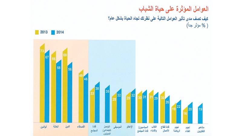 وكان 17% من الشباب المشاركين في استطلاع عام 2011 قد اعتبروا أن القيم التقليدية أصبحت بالية، وارتفعت هذه النسبة إلى 35% عام ،2012 وإلى 40% عام 2013 . وتتشابه وجهات النظر إزاء الحداثة في كافة أرجاء المنطقة، مع اعتقاد 44% من المشاركين في منطقة الخليج العربي و46% في البلدان العربية الأخرى أن القيم التقليدية أصبحت شيئاً من الماضي .