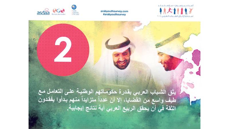 يثق الشباب العربي بقدرة حكوماتهم الوطنية على التعامل مع طيف واسع من القضايا، بما في ذلك معايير المعيشة، والاستقرار الاقتصادي، والبطالة . ولكن الزخم الإيجابي الذي تخلل ثورات الربيع العربي بدأ يتلاشى، حيث تراجع مستوى الثقة بقدرتها على إحداث أثر إيجابي طويل الأمد .