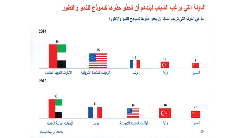 وعلى نحو مماثل، وعندما سئل المشاركون عن الدولة التي يرغبون لبلدهم أن تحذو حذوها كنموذج للنمو والتطور، حافظت دولة الإمارات العربية المتحدة مجدداً على المرتبة الأولى للسنة الثالثة على التوالي بمعدل اثنين من أصل كل 5 مشاركين(39%)- مقارنةً مع 30% في عام 2013 -تليها الولايات المتحدة الأمريكية (25%)، وفرنسا (14%)، وتركيا (10%) والصين (7%) .