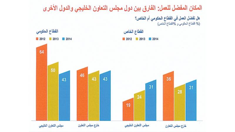وفي حين يزداد تفضيل الشباب لوظائف القطاع الخاص بشكل ثابت في منطقة الخليج بفعل البرامج الحكوميّة الشاملة، ينحسر هذا التوجّه في البلدان غير الخليجيّة التي تعاني اقتصاداتها من الركود والانكماش، وتتزايد فيها صعوبة إيجاد وظائف في القطاع الخاص . وقد ارتفع مستوى تفضيل الشباب لوظائف القطاع الخاص إلى 31% في دول مجلس التعاون الخليجي مقارنةً مع 24% في عام 2013 و19% في عام 2012 . وفي المقابل، ارتفعت نسبة تفضيل الوظائف الخاصة في البلدان غير الخليجيّة إلى 31% في عام 2014 مقارنًة مع 28% في عام 2012 و36% في عام 2012 .