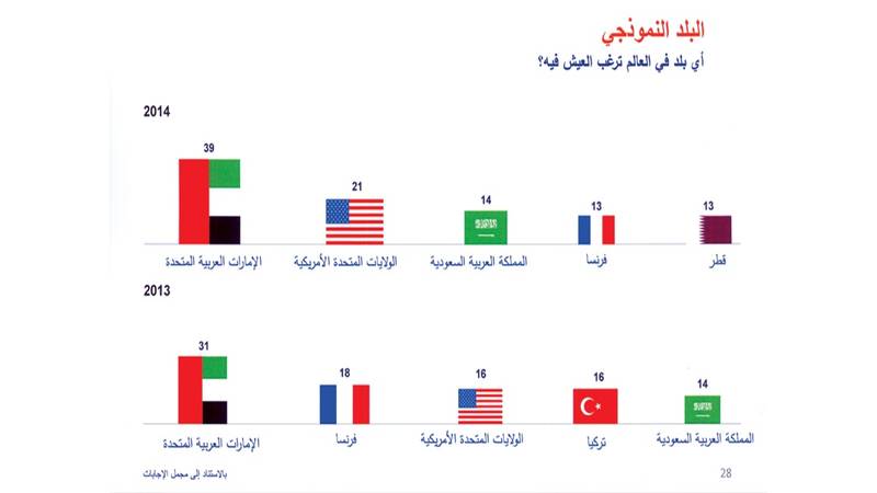 وقال 39% من الشباب إنهم يرغبون لبلادهم أن تحذو حذو الدولة كنموذج للنمو والتطور، وعندما طلب إليهم تسمية البلد الذي يفضلون العيش فيه أكثر من غيره في العالم، وقع اختيار الشباب العرب مجدداً على دولة الإمارات العربية المتحدة التي تقدمت على 20 بلداً، بما فيها الولايات المتحدة الأمريكية، والمملكة المتحدة وفرنسا وألمانيا . وأعرب 2 من أصل كل 5 أشخاص (39%) عن تفضيلهم العيش في الإمارات، وذلك مقارنةً مع 31% في عام 2012 . وهو ما يمثل تقريباً ضعف نسبة المشاركين الذين اختاروا الولايات المتحدة الأمريكية (21%)، فيما جاءت المملكة العربية السعودية في المرتبة الثالثة (14%) متفوقةً على كل من فرنسا (13%) وقطر (13%) .