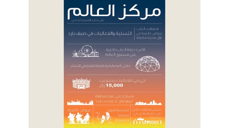 إن مفهوم مول العالم مختلف كلياً عن غيره من مراكز التسوق والضيافة . فهو يضم بين جنباته توليفة متكاملة لزواره من مرافق ضيافة إلى محال تجزئة وخدمات رعاية صحية علاوة على عدد من الأنشطة الثقافية المتعددة تحت سقف واحد . إن المركز يشكل إضافة ترضي أذواق سياح الإمارة وتوفر للزوار من مختلف أنحاء العالم مرافق وعوامل جذب إضافية .