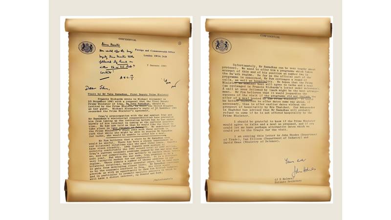 كتب سكرتير الحكومة الخاص، جيه . إي . هولمز، في رسالة موجهة إلى رئاسة الوزراء، بتاريخ 7 يناير/كانون الثاني 1983 يتحدث فيها عن زيارة النائب الأول لرئيس الوزراء العراقي، طه ياسين رمضان . . ومما جاء فيها: