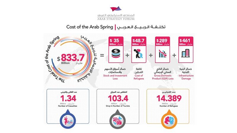 بلغت تكلفة الربيع العربي 833.7 مليار دولار (أكثر من 3 تريليونات درهم) شاملةً تكلفة إعادة البناء وخسائر الناتج المحلي والسياحة وتكلفة اللاجئين وخسائر أسواق الأسهم والاستثمارات. جاء ذلك في تقرير «تكلفة الربيع العربي» الذي أصدره المنتدى الاستراتيجي العربي. وتناول التقرير بالأرقام نتائج هذه التداعيات وانعكاساتها السلبية على التنمية الاقتصادية والاجتماعية في المنطقة.