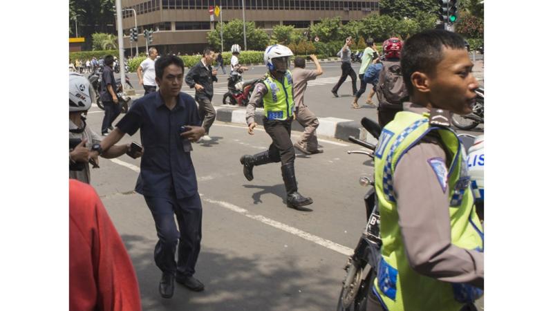 وقد شن خمسة متطرفين بالإجمال هجوماً استخدموا فيه المتفجرات في حي ثامرين بوسط العاصمة الإندونيسية الذي يضم مراكز تجارية ومكاتب عدد كبير من وكالات الأمم المتحدة والسفارات، لاسيما سفارة فرنسا التي سمعت منها أصداء الانفجارات. وأسفرت الاعتداءات وتبادل إطلاق النار أيضاً عن سقوط 20 جريحاً، فيما دمر أحد أكشاك الشرطة. وسارع الرئيس الإندونيسي جوكو ويدودو إلى إدانة هذه الأعمال «الإرهابية». وأعلنت الشرطة أن المهاجمين الخمسة قد قتلوا. وأعلن التنظيم الإرهابي في بيان تبنيه التفجيرات في جاكرتا.