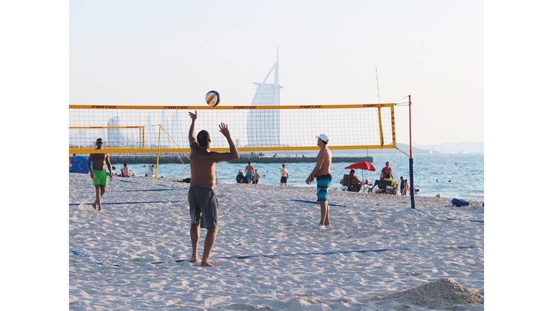 وفي طريقك لمياه الشاطئ تحاصرك أجواء المرح والحماسة من كل جانب، فتلتقط أذناك صيحات الانتصار الصادرة من لاعبي الكرة الطائرة الشاطئية، التي تنتشر ملاعبها على طول الشاطئ، وتعج باللاعبين من كل الأعمار، وستجد من يجذبك من يدك لتشاركهم اللعب، وتكمل الفريق، لتجد نفسك ضمن مجموعة لاعبين يملؤهم الحماس والنشاط والمرح، وتتعالى صيحات التشجيع بكل لغات العالم من رواد الشاطئ، الذين يشكلون صورة مصغرة من بانوراما دبي البشرية الرائعة.