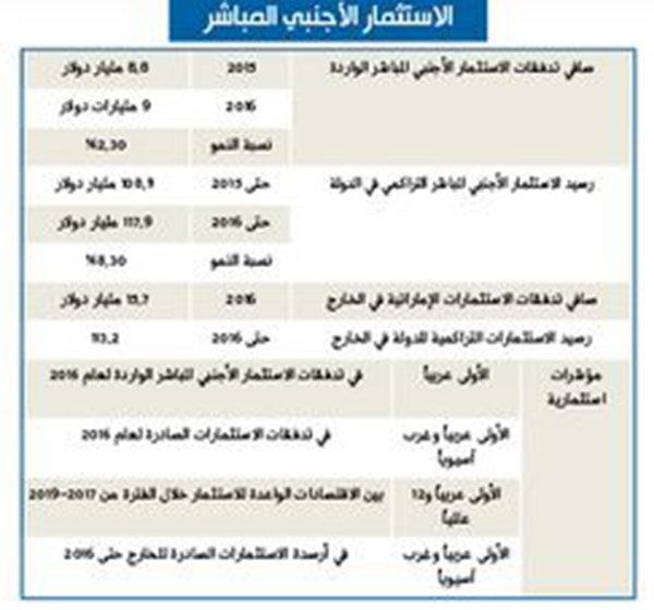 وقد بلغ صافي تدفقات الاستثمار الأجنبي المباشر الواردة إلى الإمارات عام 2016 نحو 9 مليارات دولار (33 مليار درهم)، مرتفعاً من 8.8 مليار دولار في عام 2015، بنسبة نمو بلغت نحو 2.3%، على الرغم من التراجع الطفيف الذي شهدته التدفقات العالمية خلال العام نفسه على المستوى العالمي، حيث انخفضت بنسبة 1.6%، فيما بلغ إجمالي الاستثمارات الإماراتية في الخارج في عام 2016 نحو 15.7 مليار دولار، وجاءت الإمارات بذلك في المرتبة الأولى عربياً من حيث حجم تدفقات الاستثمار الأجنبي المباشر الصادرة والواردة، وهو ما يعكس التنافسية الاستثمارية المتزايدة لقطاع الأعمال والاستثمار في الإمارات.