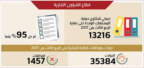 تم خلال الأشهر التسعة الأولى من 2017 مراجعة قانون العلامات التجارية وقانون حماية المستهلك وقانون الغش التجاري ليتوافق مع تشريعات دول مجلس التعاون، كما تم إعداد مشروع قانون معدل للتستر التجاري ومشروع قانون للمخزون الاستراتيجي واللائحة التنفيذية لقانون الغش التجاري. ويجري العمل حالياً على إعداد مشروع متطور لقانون الجمعيات التعاونية.