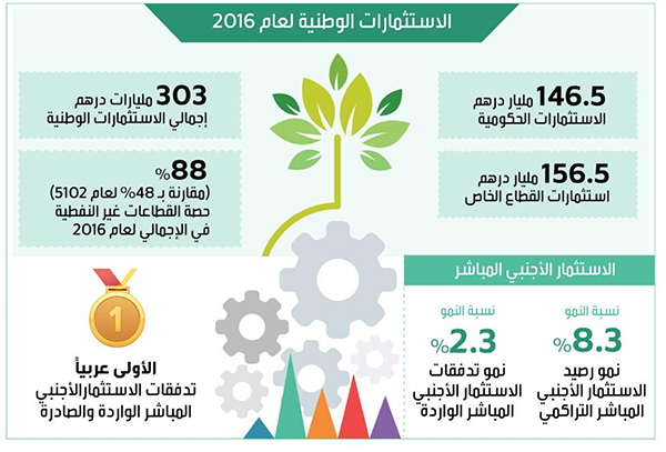وقد بلغ إجمالي الاستثمارات الوطنية خلال 2016 نحو 303 مليارات درهم، منها نحو 146.5 مليار استثمارات حكومية، بارتفاع طفيف عن 2015 بلغت نسبته 0.4%، فيما وصلت استثمارات القطاع الخاص خلال 2016 إلى 156.5 مليار درهم. وقال المنصوري إن تواصل ونمو الإنفاق الاستثماري على مشاريع التنمية والتنويع الاقتصادي يعكس جانباً مهماً من الاستراتيجية الحكومية.