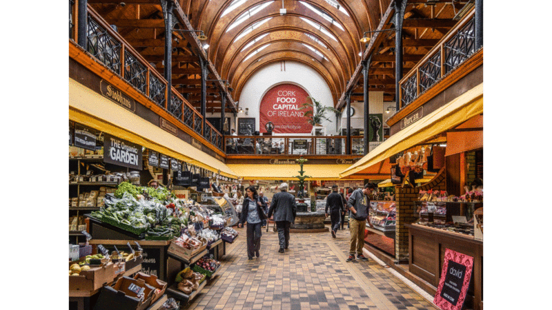 يعتبر السوق الإنجليزي المعروش أحد أفضل الأسواق في مدينة كورك، حيث يتميز بأجواء حيوية ومجموعة من محال بيع اللحوم الفواكه والخضراوات ومحال بيع الأسماك وأكشاك الجبن الإيطالية والفرنسية والخبز الطازج وأكثر من ذلك بكثير. يتجمع التجار هنا لبيع بضاعتهم منذ عام 1788 ومازال يتمتع بشعبية لدى السكان المحليين والسياح الزائرين الذين يمكنهم قضاء ساعات في البحث عن الهدايا التذكارية الخاصة بين الملابس والأواني الفخارية والفنون والتحف الجديدة.