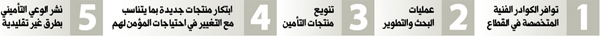 تعزيز عمليات البحث والتطوير R&D: إن ما يؤخذ على معظم أسواق التأمين في المنطقة هو انخفاض الاهتمام بعمليات البحث والتطوير في قطاع التأمين، لذلك فإنه ما زال هناك متسع من المجال أمام أسواق التأمين بشكل عام وأسواق التأمين في المنطقة العربية بشكل خاص في مجال التطوير والاعتماد على التكنولوجيا الحديثة في صناعة التأمين.