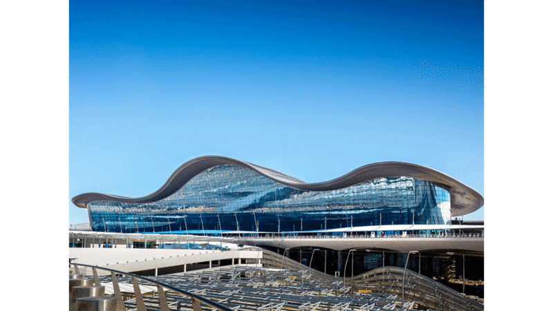 وتجدر الإشارة إلى أن تصميم مجمع المطار الجديد تم استيحاؤه من جمال وتناسق الكثبان الرملية في البيئة الصحراوية المذهلة لإمارة أبوظبي.