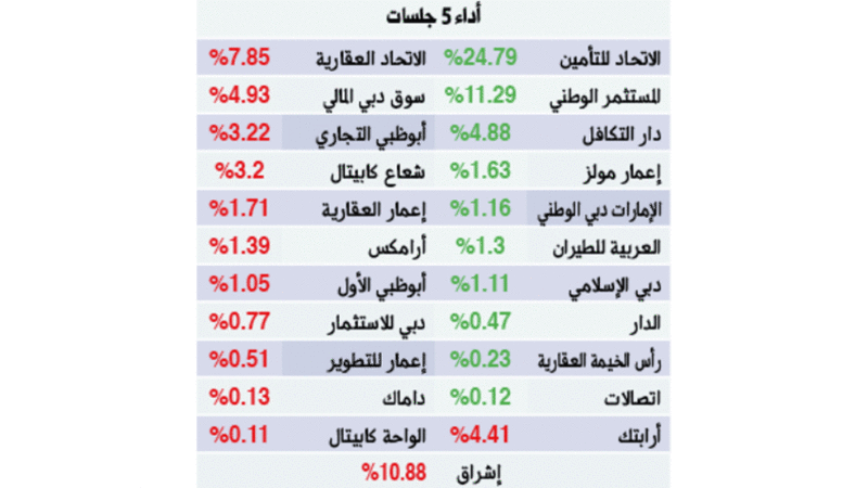 وفي ما يتعلق بالتحركات الأسبوعية للأسهم، ارتفع «الإمارات دبي الوطني» 1.16%، و«دبي الإسلامي» 1.11%، و«إعمار مولز» 1.63%، و«الدار» 0.47%، و«رأس الخيمة العقارية» 0.23%، و«اتصالات» 0.12%، و«العربية للطيران» 1.3%، و«دار التكافل» 4.88%.وفي المقابل، انخفضت أسهم «أبوظبي الأول» 1.05%، و«أبوظبي التجاري» 3.22%، و«إعمار العقارية» 1.71%، و«الاتحاد العقارية» 7.85%، و«أرابتك» 4.41%، و«إعمار للتطوير» 0.51%، و«داماك» 0.13%.