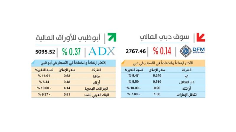 وشهد «دو» أكبر ارتفاع بنسبة 9.47% في سوق دبي، في مقابل تراجع «أرابتك» بنسبة 10%، وهي أكبر نسبة انخفاض في السوق.