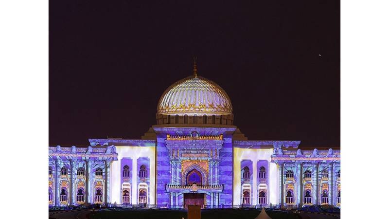 ومن ضمن مواقع مهرجان أضواء الشارقة «مسجد النور» الذي يتزين بألوان الأضواء وزخارفها الجميلة ليكشف عن معالمه ويضيء تفاصيله الهندسية في لوحة فنية تأسر الألباب من إبداعات الفنان الباكستاني سيد عتيق الرحمن بعنوان «رحلة كونية».