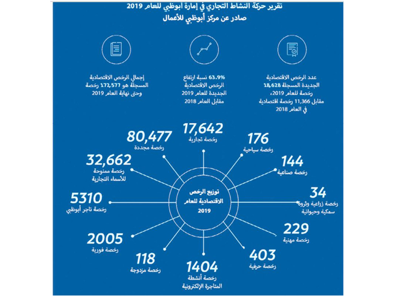 حسب ما جاء في تقرير حركة النشاط التجاري في إمارة أبوظبي للعام 2019، فإن الرخص من نوع تجاري استحوذت على النصيب الأكبر من إجمالي الرخص الجديدة الصادرة عن مركز أبوظبي للأعمال، وذلك بنسبة 94.7%، بواقع 17,642 رخصة تجارية، حيث بلغت نسبة نموها 66.3% خلال العام الماضي مقارنة بالرخص التجارية الصادرة عام 2018 البالغ عددها 10,608 رخص.