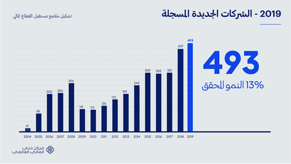 بلغ إجمالي عدد الشركات المالية النشطة في المركز المالي 737 شركة، بزيادة 18% عن 2018، ونمو 64% خلال خمسة أعوام. وتشمل أبرز عمليات التسجيل في 2019 «ورلد فيرست»، التابعة لمجموعة «آنت فاينانشال» للخدمات المالية، و«مايبنك بيرهاد الإسلامي» الماليزي، و«كانتور فيتزجيرالد» الأمريكية للخدمات المالية، وبنك «موريشيوس التجاري».