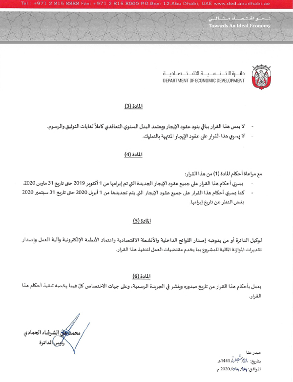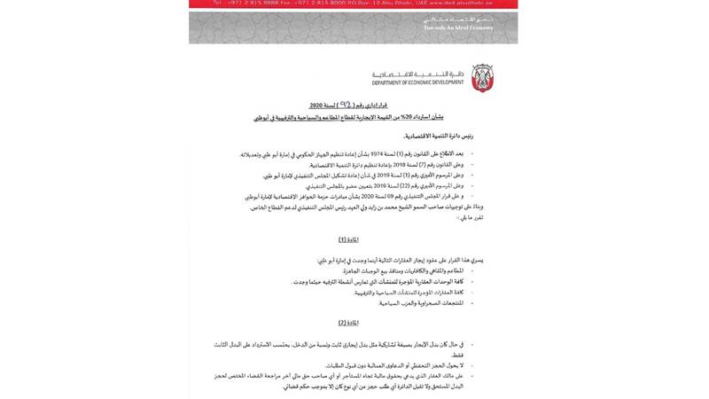 أصدرت دائرة التنمية الاقتصادية في أبوظبي قراراً إدارياً بشأن استرداد 20% من القيمة الإيجارية لقطاع المطاعم والسياحة والترفيه في الإمارة. ويسري القرار رقم 92 لسنة 2020 على عقود إيجار العقارات في جميع أرجاء أبوظبي، وتتضمن المطاعم والمقاهي والكافتيريات ومنافذ بيع الوجبات الجاهزة، وكافة الوحدات العقارية المؤجرة للمنشآت التي تمارس أنشطة الترفيه، والعقارات المؤجرة للمنشآت السياحية والترفيهية، والمنتجعات الصحراوية والعزب السياحية.