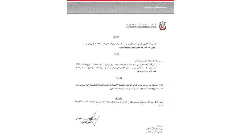 وذكرت الدائرة أن أحكام القرار تسري على جميع عقود الإيجار الجديدة التي أبرمت من 1 أكتوبر 2019 وحتى 31 مارس 2020، وعلى جميع عقود الإيجار التي تم تجديدها من 1 إبريل 2020 وحتى نهاية العام الجاري.