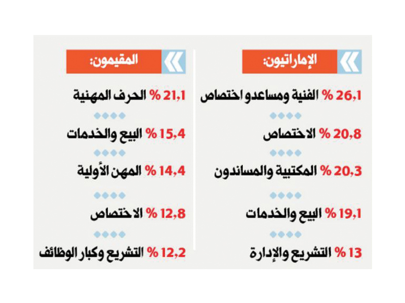 أما على صعيد المقيمين؛ فقد جاءت الوظائف الحرفية والمهن المرتبطة بها أولاً بما نسبته 21.1% من إجمالي وظائف الإمارة خلال 2019، ووظائف البيع والخدمات ثانياً 15.4%، والمهن الأولية ثالثاً 14.4%، ومهن الاختصاص رابعاً 12.8%، ومهن التشريع وكبار الموظفين خامساً 12.2%، والمهن الفنية ومساندة الاختصاص سادساً 9.8%، ومهن تشغيل المصانع والآلات وعمال التجميع سابعاً 9.4%، والوظائف المكتبية والمساندة ثامناً 4.8 %، وأخيراً المهن الحرفية في الزراعة والغابات وصيد الأسماك بما نسبته 0.1% خلال العام الماضي 2019.