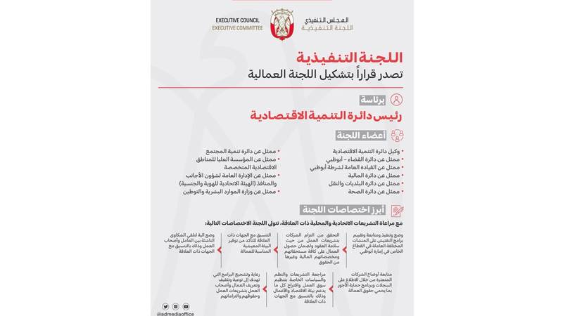 أصدرت اللجنة التنفيذية التابعة للمجلس التنفيذي لإمارة أبوظبي قراراً بتشكيل اللجنة العمالية، برئاسة رئيس دائرة التنمية الاقتصادية، وعضوية وكيل الدائرة وممثلين عن دوائر القضاء والمالية والبلديات والنقل والصحة وتنمية المجتمع والقيادة العامة لشرطة أبوظبي والإدارة العامة لشؤون الأجانب والمنافذ (الهيئة الاتحادية للهوية والجنسية)، إضافة إلى ممثلين عن المؤسسة العليا للمناطق الاقتصادية المتخصصة، وممثل عن وزارة الموارد البشرية والتوطين.