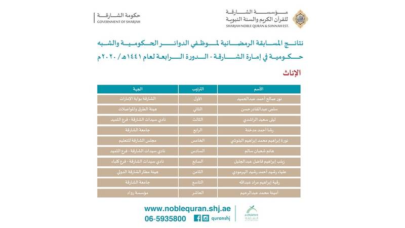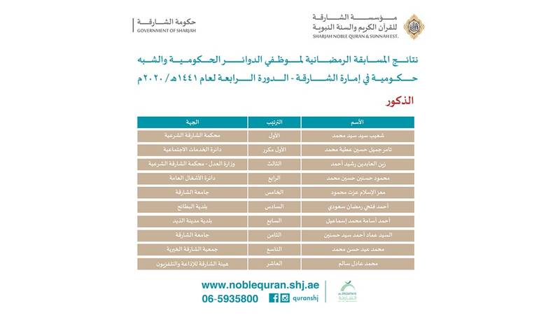 أعلنت مؤسسة «الشارقة للقرآن الكريم والسنة النبوية» نتائج المسابقة الرمضانية لموظفي الدوائر الحكومية وشبه الحكومية، في الإمارة، في دورتها الرابعة لعام 1441هـ 2020م، بعد أن أنهت في شهر رمضان الماضي اختباراتها للمتقدمين للمسابقة.