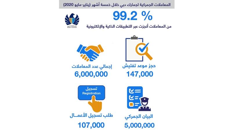 واصل اقتصاد دبي زخمه على الرغم من تداعيات انتشار جائحة كورونا عالمياً، حيث قفزت المعاملات الجمركية التي أنجزتها جمارك دبي بواقع 36% للأشهر الخمسة الأولى من العام الجاري لتصل إلى 5.9 مليون معاملة مقارنة مع 4.4 مليون معاملة للفترة ذاتها من العام الماضي، وسجل عدد المعاملات لشهر مايو الماضي 1.1 مليون معاملة جديدة، مقارنة مع 994 ألف معاملة في مايو 2019، وبنمو 10.6%، ويعكس نمو المعاملات في ظل الإجراءات والتدابير الاحترازية العالمية نجاح إمارة دبي في الاستجابة لتداعيات كورونا والحد من آثارها على القطاعات الاقتصادية بشكل عام والقطاع التجاري خصوصاً، وذلك بفضل بنيتها اللوجستية المتطورة، وخدماتها الذكية ومبادراتها التحفيزية.