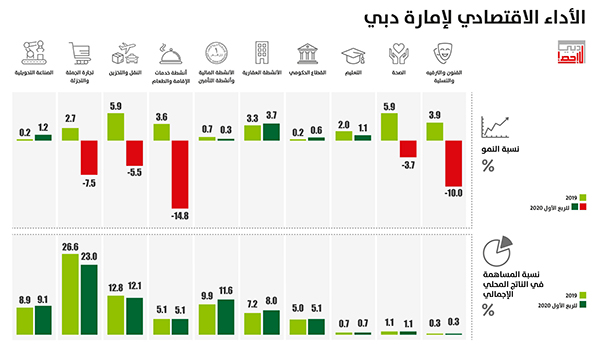 وكان صندوق النقد الدولي قد كشف عن توقعاته بتراجع الاقتصادات المتقدمة بنسبة 8% والاقتصاديات النامية بنسبة 3% في عام 2020 فيما كانت قد حققت نمواً مقداره 1.7% و3.7% في عام 2019 على التوالي. هذا في حين توقع تراجع اقتصادات الشرق الأوسط وآسيا الوسطى بنسبة 4.7% في عام 2020 بعد نمو بلغ 1% في عام 2019 الأمر الذي يبين أنه عند استقراء واقع الاقتصاد العالمي لعام 2019 وللربع الأول من العام الجاري فإنه يبين أن الأداء الاقتصادي لإمارة دبي يتبع نفس النهج في كلا الفترتين، وذلك قياساً على أداء وظروف الاقتصاد الإقليمي والعالمي، مع تحقيق اقتصاد الإمارة نمواً إيجابياً في العام 2019 إذ بلغ الناتج المحلي الإجمالي للإمارة 407,424 مليار درهم محققاً نمواً بنسبة 2.2% مقارنة بالعام 2018.