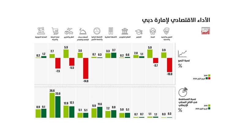 وأوضح المركز أن اقتصاد دبي بعد أن حقق نمواً قدره 2.2% خلال العام 2019، إلا أن الظروف الاستثنائية بالغة الصعوبة التي يمر بها العالم جراء الأزمة الطاحنة التي أصابت مفاصل الاقتصاد العالمي بشبه الشلل التام وكانت بداياتها مع مطلع العام الجاري والتي ما لبثت أن أخذت في تداعياتها الصحية والاقتصادية في التصاعد على مدار الأشهر الماضية، تسببت في تراجع الناتج المحلي الإجمالي الحقيقي (بالأسعار الثابتة) لإمارة دبي بنسبة 3.5% خلال الربع الأول من 2020، إذ تمكنت دبي بفضل سياساتها المالية المتوازنة والتعامل الرشيد مع الأزمة بمختلف أبعادها، من التخفيف إلى حد كبير من التبعات الثقيلة التي خلفتها الجائحة على العالم بسبب الإجراءات الاحترازية الصارمة وغير المسبوقة التي أدت إلى إغلاق أغلب دول العالم لحدودها ومنافذها الجوية والبحرية والبرية، ومن ثم تقييد حركة التجارة العالمية، وكذلك التأثير السلبي على أغلب الأنشطة الأساسية مثل حركة السفر والسياحة ما أثر بصورة سلبية وبدرجة لم يعهدها العالم منذ «الكساد الكبير» الذي ضرب الاقتصاد العالمي في العام 1929.