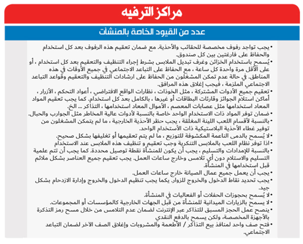 وشملت الأنشطة المدرجة ضمن بروتوكول إعادة افتتاح وتشغيل مراكز الترفيه، المعارض الترفيهية ومرافق الترفيه العلمي، والمنشآت التي تقدم خدمة ركوب الألعاب، وأنشطة الترفيه التفاعلي، ومناطق اللعب والمغامرات الداخلية والألعاب القابلة للنفخ المخصصة للأطفال، والأركيد، والمتاهات وغرف الهرب، إضافة إلى منشآت الواقع الافتراضي.